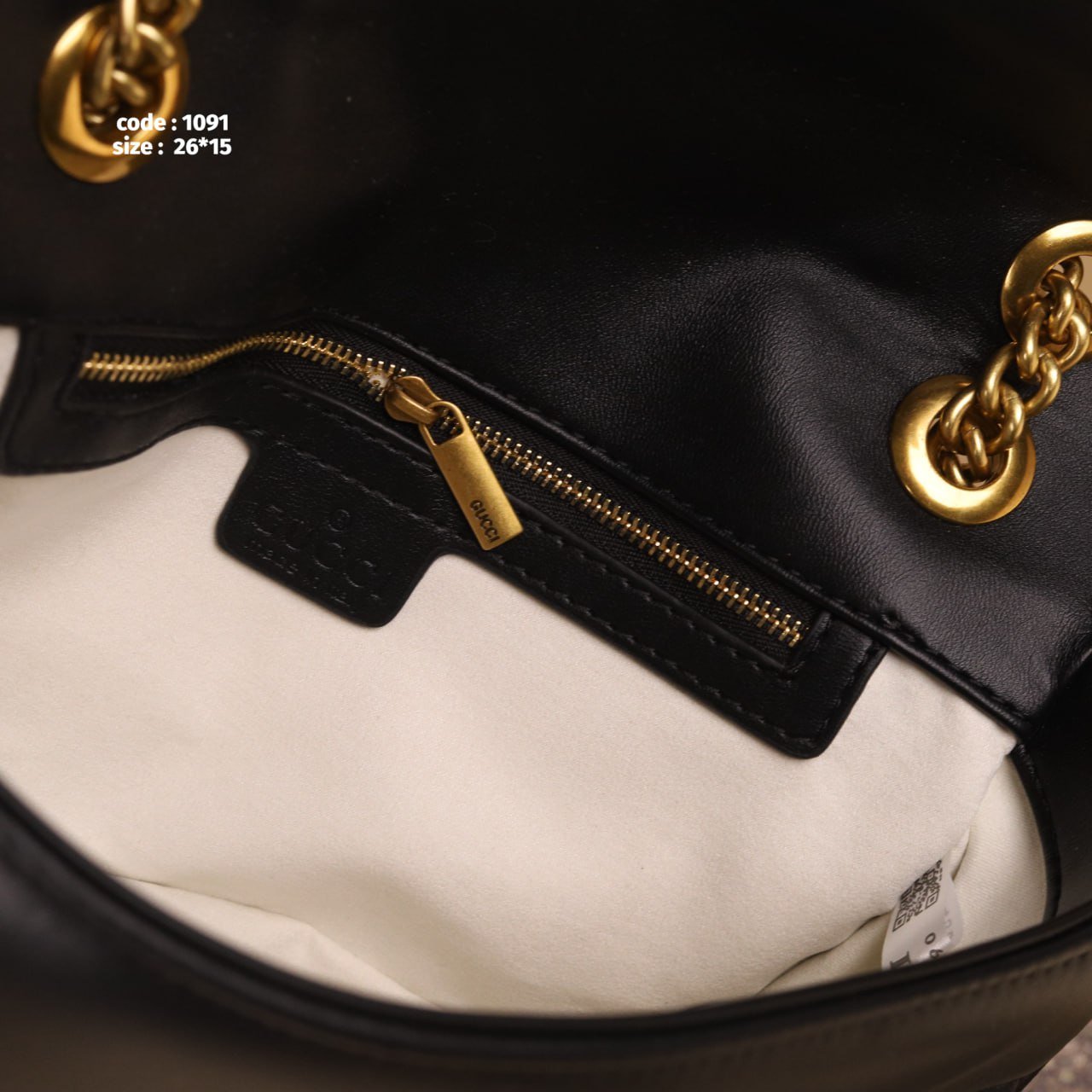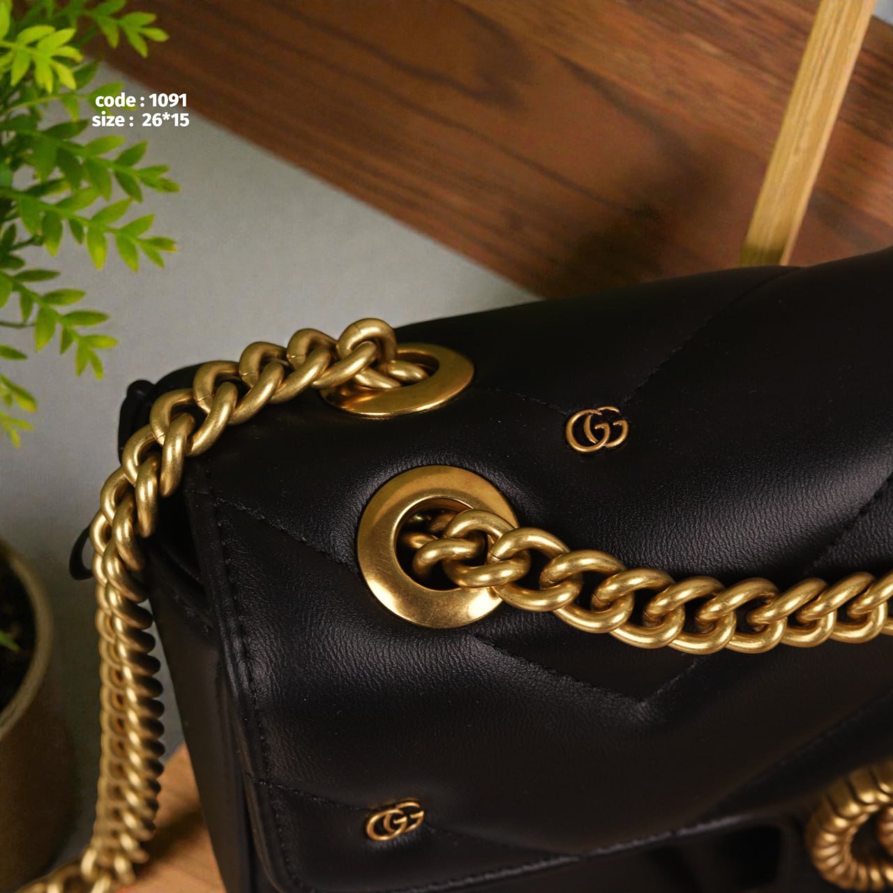 حقيبة كتف سوداء فاخرة بتصميم أنيق جدًا، خامة جلدية عالية الجودة، إكسسوارات وسلاسل معدنية ذهبية لامعة. مع علبتها الواقية. المقاس: 15 × 26 سم.