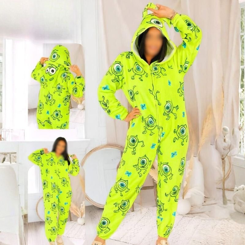Women’s imported polar fleece winter jumpsuit featuring a fun green monster design – soft, cozy, and fits 65–80 kg comfortably.