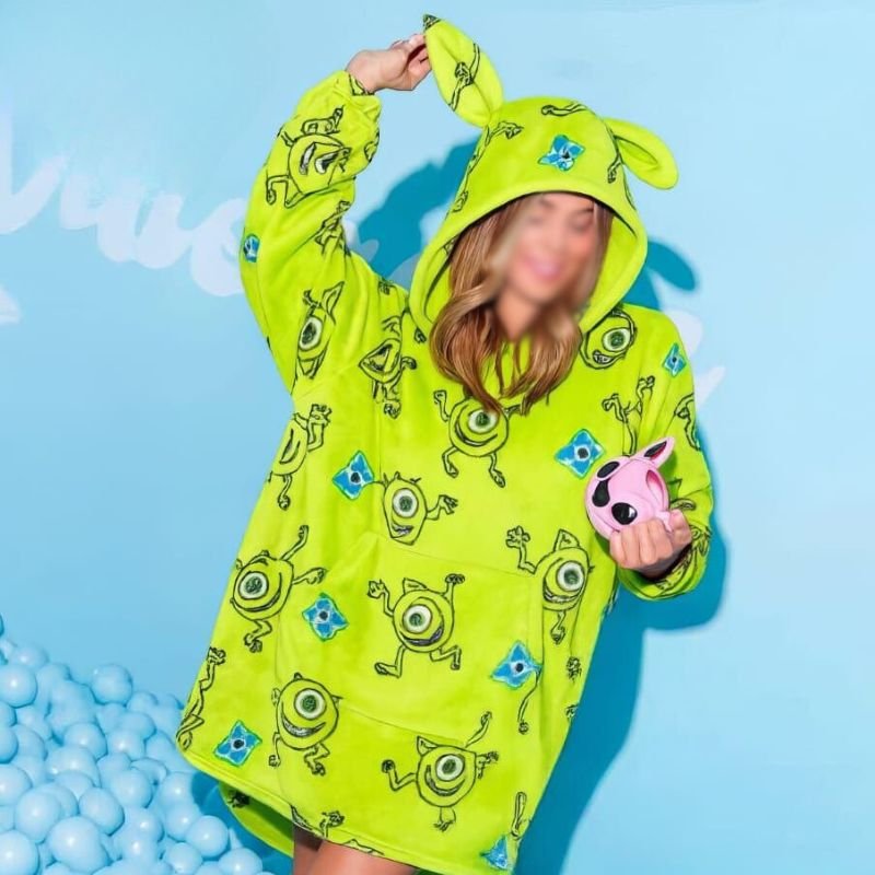 Soft Polar Blanket Hoodie with Monster pattern in fluorescent green – imported, cozy, closed design, one size fits all.